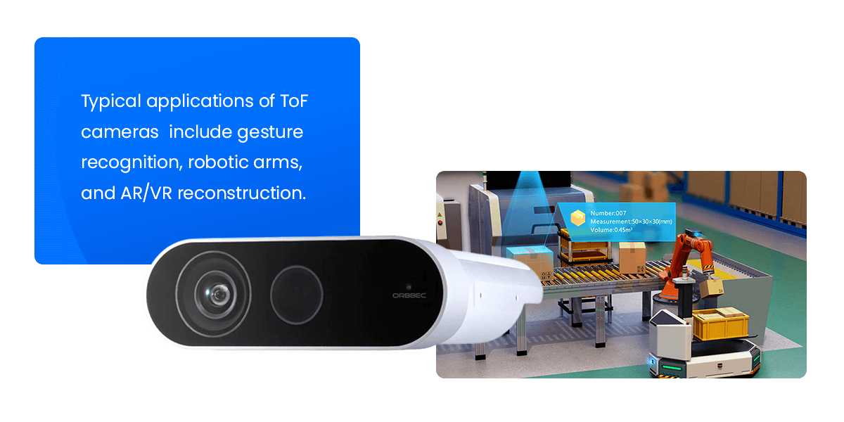 ToF cameras are less sensitive to texture and lighting variations than stereo vision, but they usually have lower spatial resolution. Their typical applications include gesture recognition, robotic arms, and AR/VR reconstruction. Other time-of-flight applications include industrial automation, healthcare, and automotive safety.