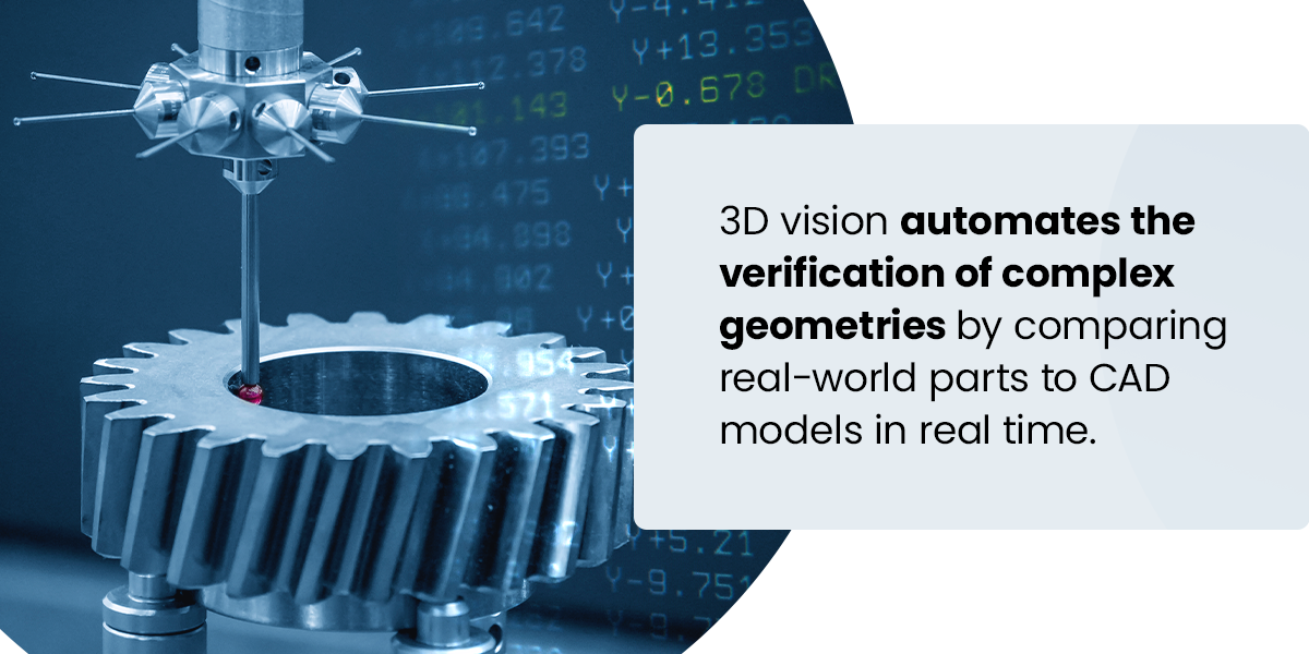 3D vision automates the verification of complex geometries. It can measure flatness, parallelism, true position, profile, runout, and more. By comparing captured point clouds to CAD, systems can compute the deviations in real time, generating a pass-fail decision with statistical evidence.