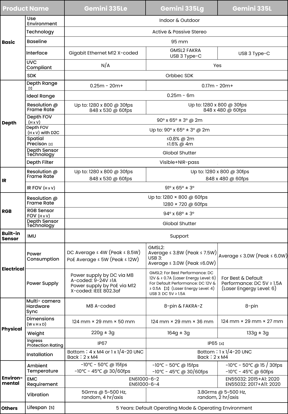 【1】Theoretical maximum depth range up to 65 meters; 【2】Data measured during factory calibration; 【3】Gemini 335Lg default laser energy level is set to Level 4 to reduce peak power consumption and prevent operational failures. When sufficient power is available, users can manually adjust the laser to the maximum Level 6 to achieve optimal performance; 【4】Both Gemini 335L & 335Lg require the use of IP65-compliant cables during power-on operations to achieve IP65 protection; 【5】No more than 16h working per day.