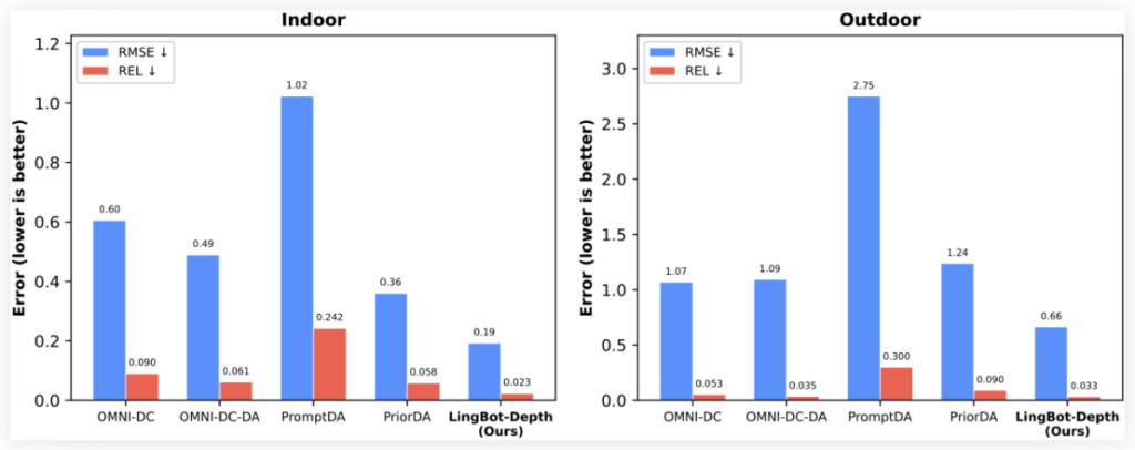 LingBot-Depth outperforms major existing models on the most challenging sparse depth completion task. Lower values indicate better performance. (Image source: Robbyant)