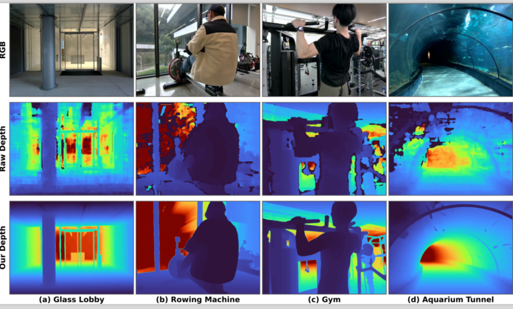 Using chip-level raw depth data from Orbbec’s cameras, LingBot-Depth significantly improves depth map completeness and edge sharpness in scenes with transparent and reflective surfaces. (Image source: Robbyant)